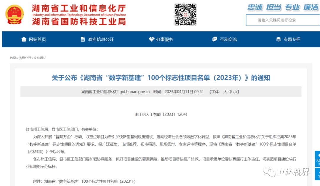 立达股份成功入选湖南省“数字新基建”100个标志性项目名单