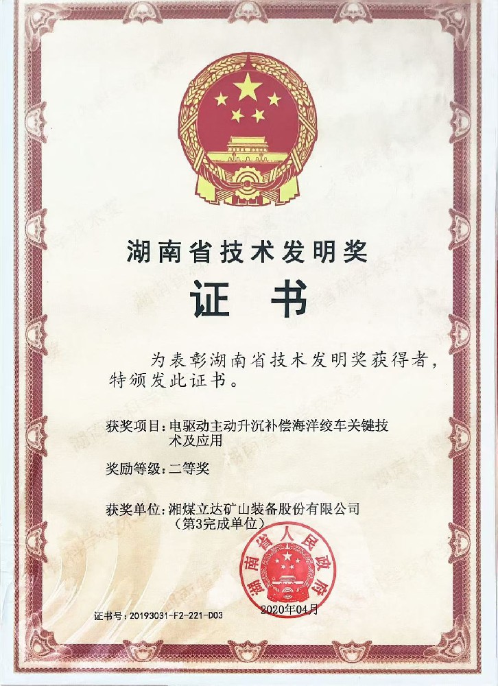湖南省技术发明奖(电驱动主动升沉补偿海洋绞车)